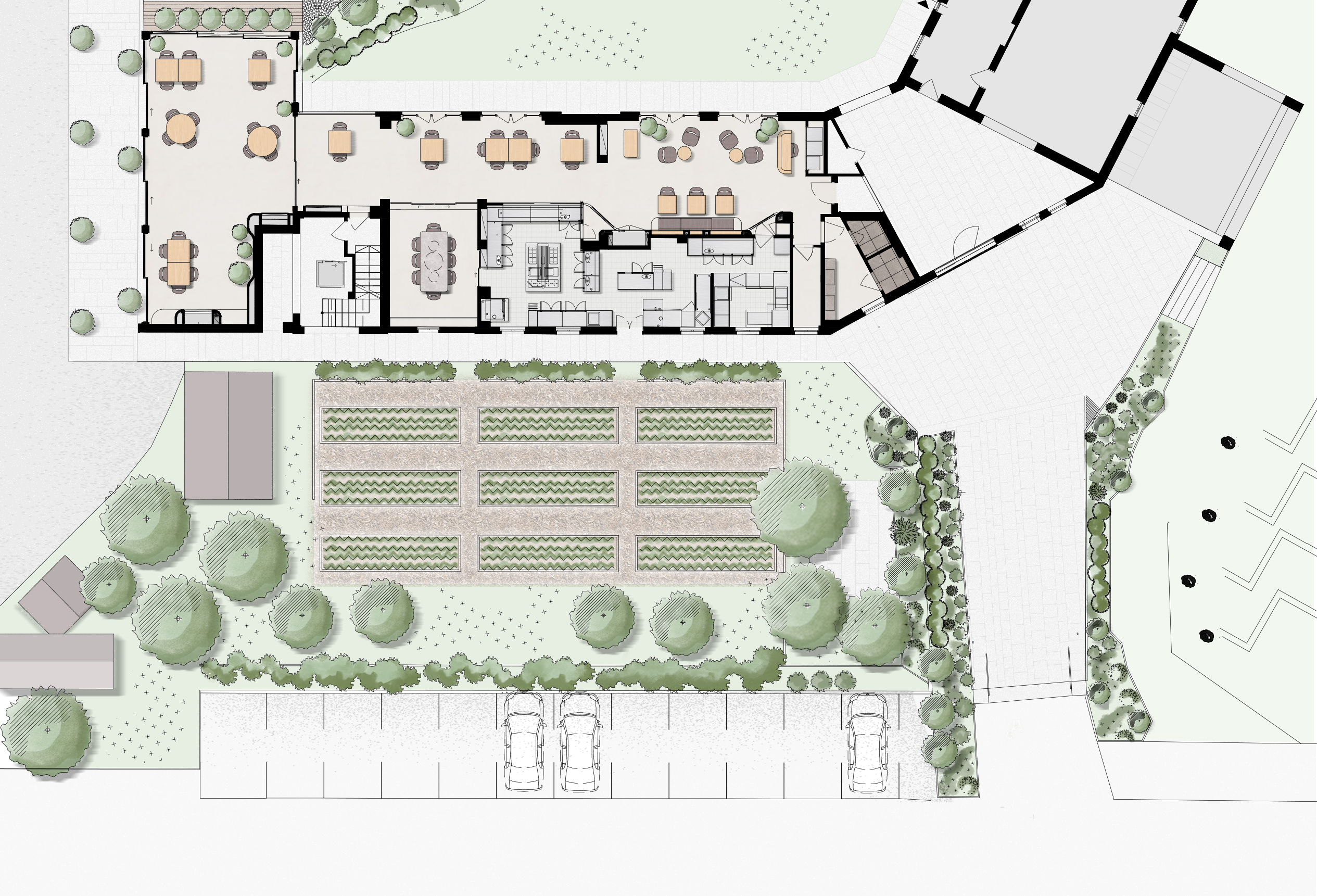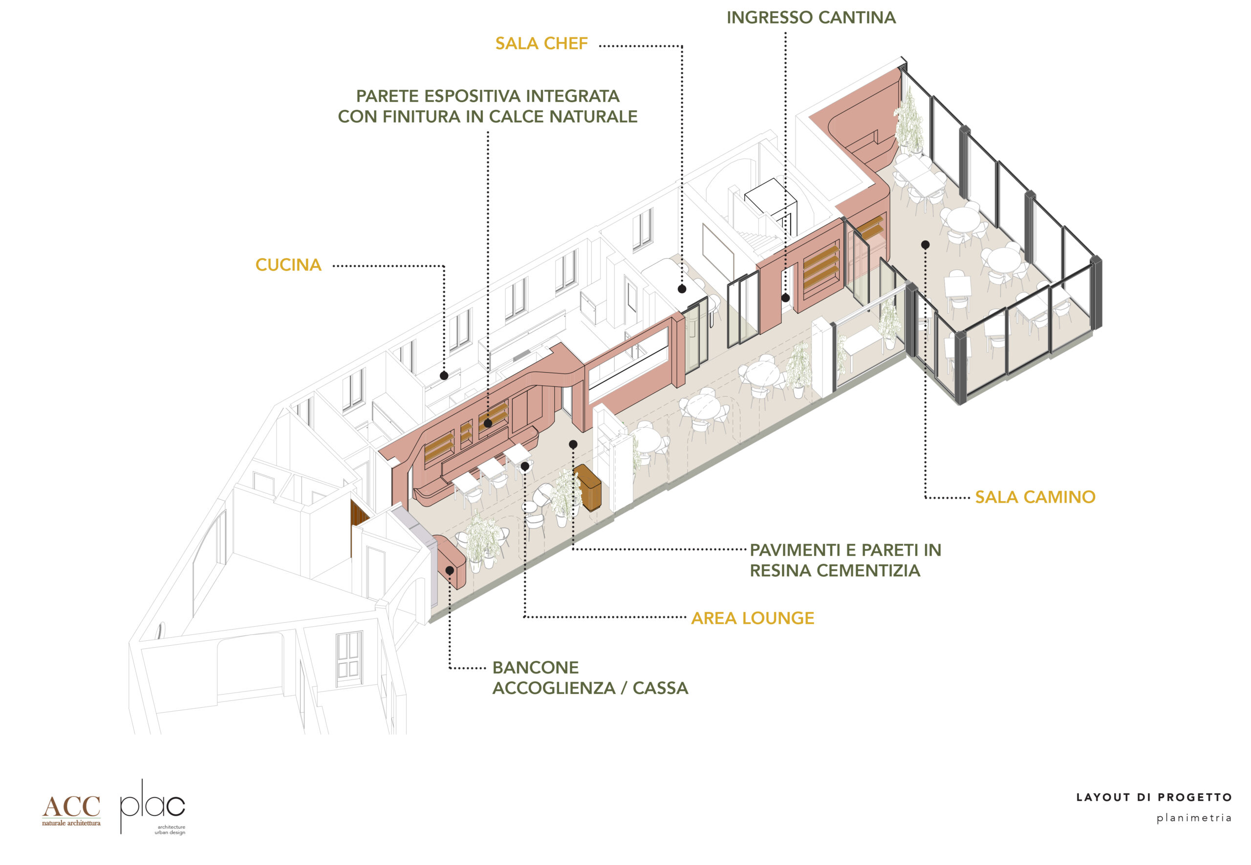 Gli interni sono stati studiati per creare un’atmosfera accogliente ed elegante, con un layout fluido che connette armoniosamente le diverse aree. Al centro del progetto si trova la parete dalle forme morbide e sinuose, che attraversa l’intero ambiente fino a collegarsi visivamente alla nuova serra. Questo elemento non solo definisce gli spazi con continuità e raffinatezza, ma diventa un segno distintivo dell’identità architettonica del locale.